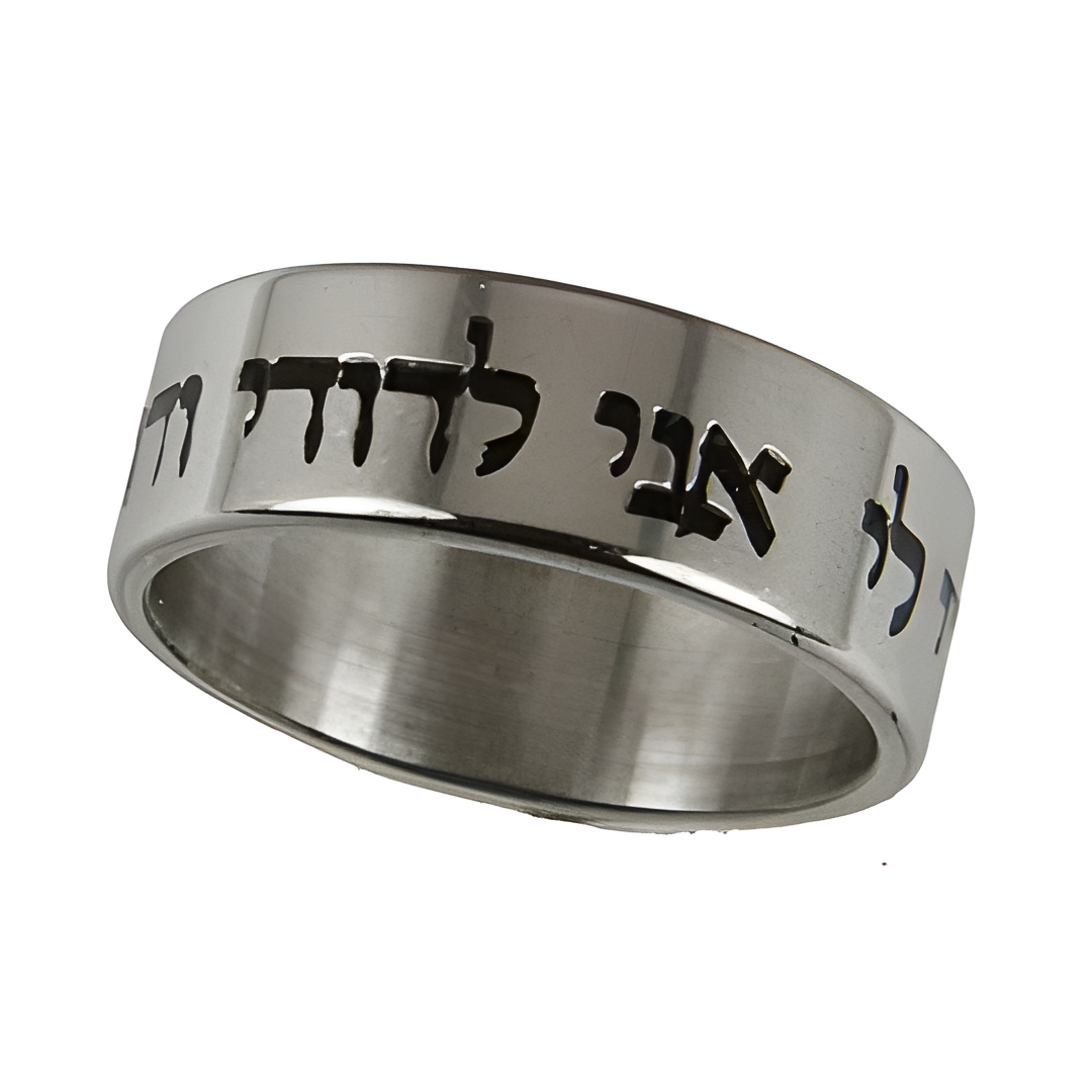 Anillo con la frase “De mi Amado”, inspirada en Shir Hashirim, diseñado para hombres y mujeres que deseen llevar un símbolo sutil de pertenencia, fidelidad y conexión con el amor divino y conyugal.