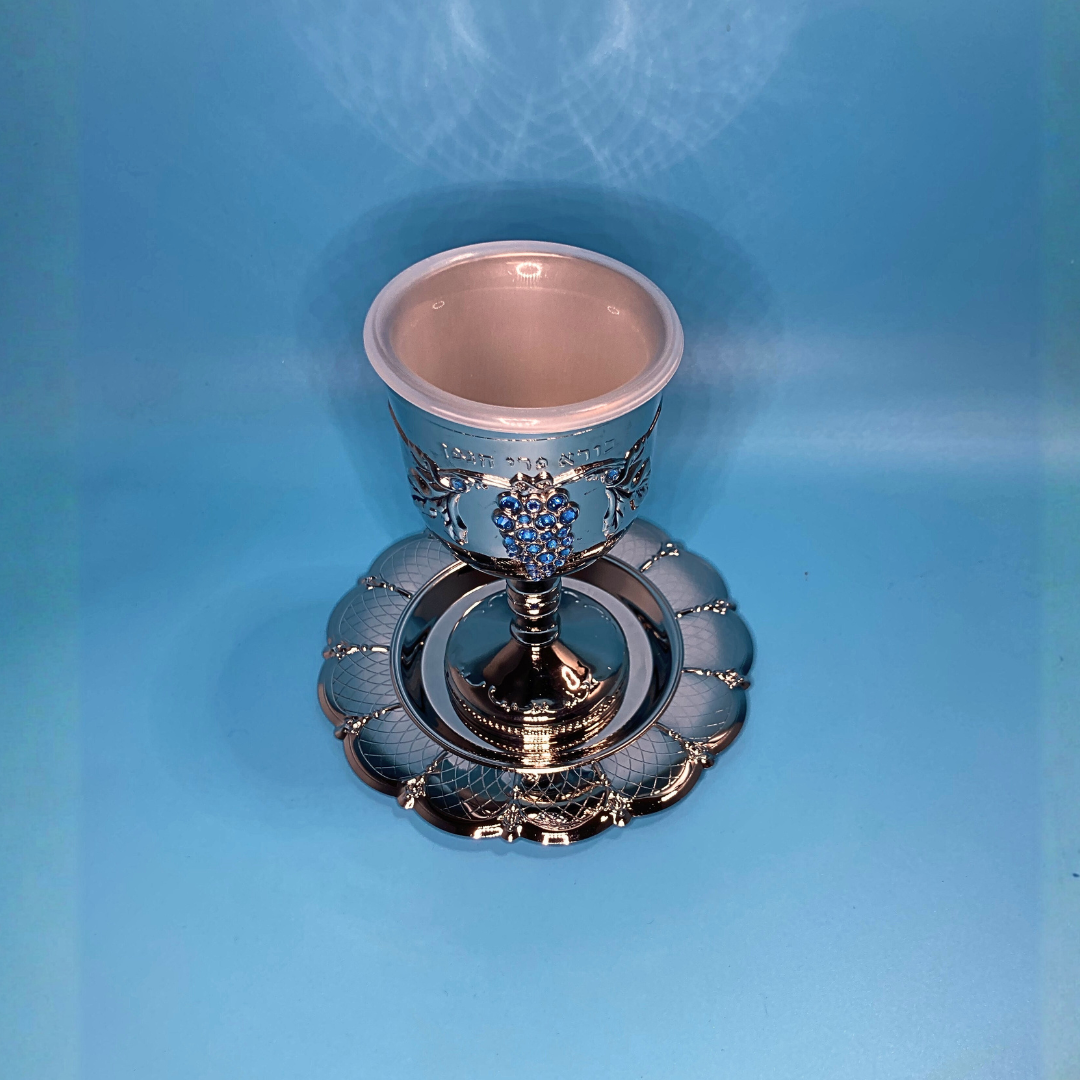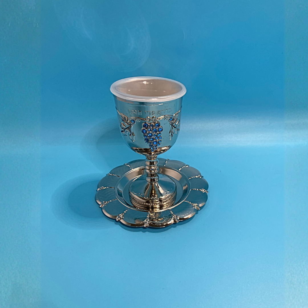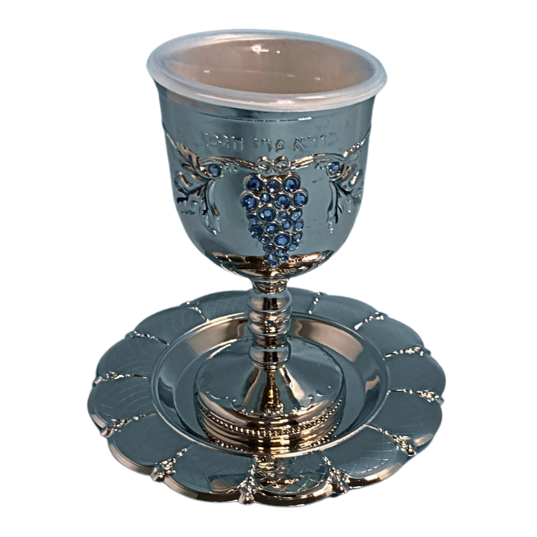 La Copa Kidush con Piedras Azules está diseñada en material de alta calidad, realzada con piedras decorativas azules. Incluye plato y plástico protector, pensando en la funcionalidad y la presentación refinada de tus ceremonias de Shabbat y festividades.
