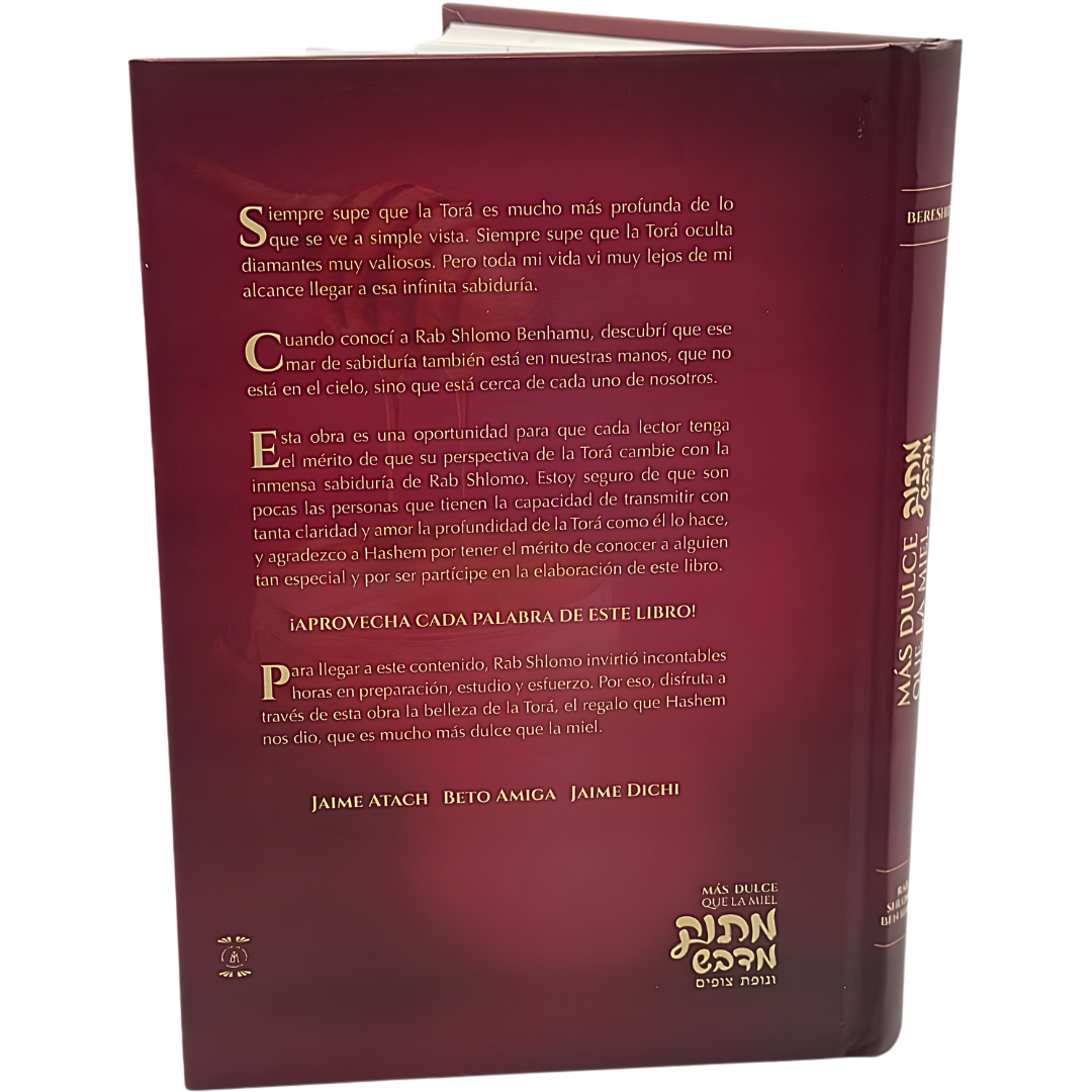 Más Dulce que la Miel es una obra que revela la belleza y la relevancia inagotable de la Torá en el día a día. Con un estilo accesible y lleno de sensibilidad espiritual, el Rab Shlomo Benhamu desentraña los mensajes ocultos en las parashiot, conectándolos con las emociones, desafíos y anhelos del lector contemporáneo.