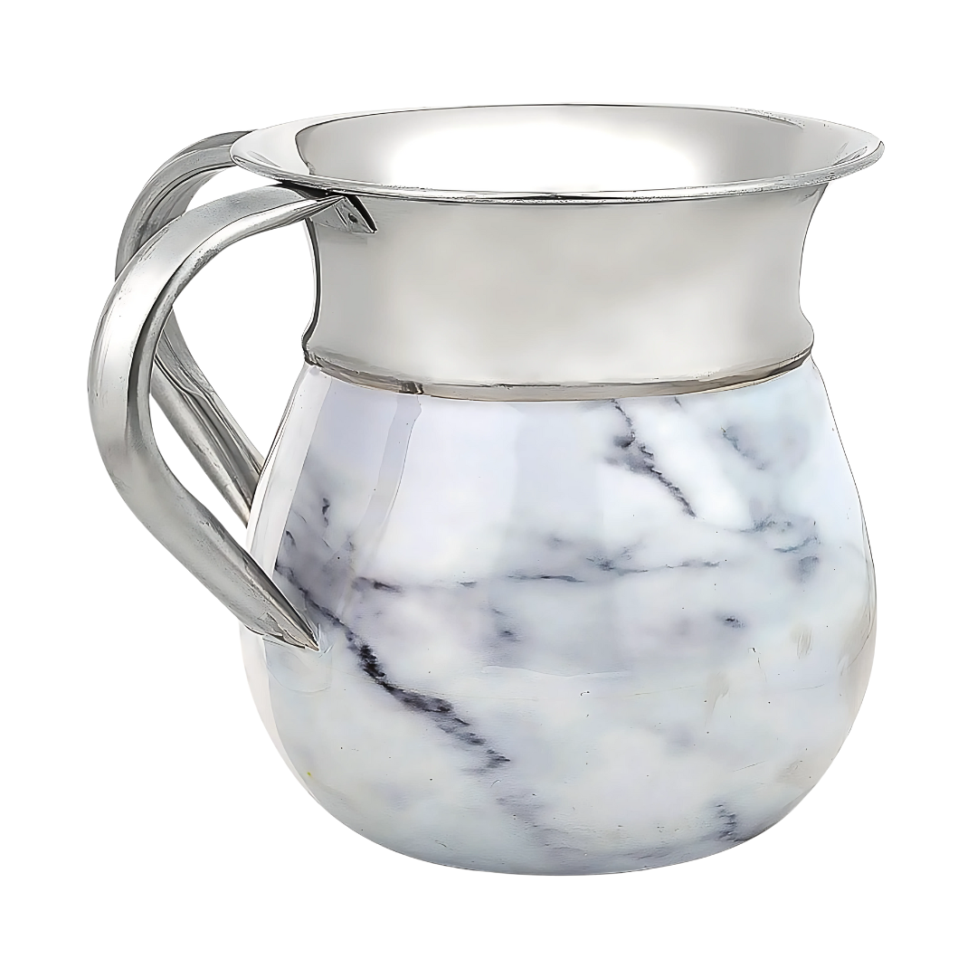 El Natla para el Lavado es mucho más que un simple recipiente: es una obra maestra diseñada para honrar la tradición del lavado de manos (Netilat Yadayim) con elegancia y autenticidad. Con su diseño inspirado en el mármol blanco Carrara, este natla de aluminio presenta una calcomanía premium que le da un acabado sofisticado y moderno.
