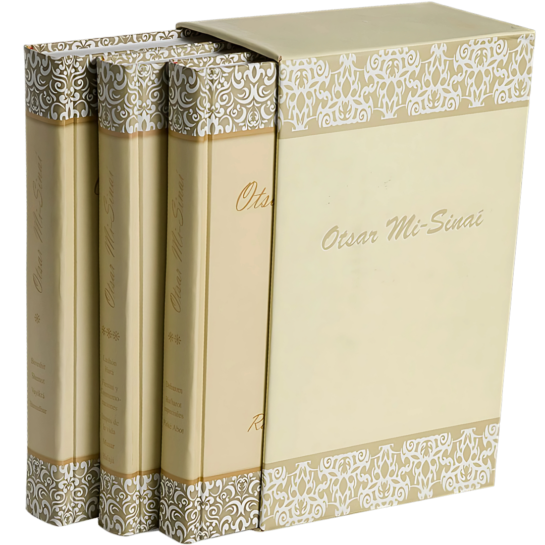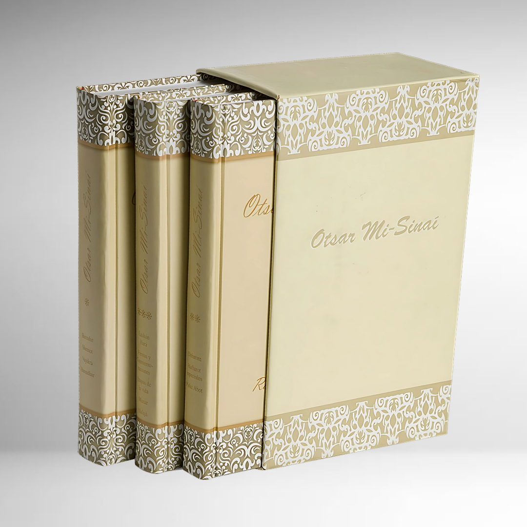 En Otsar Mi Sinai, los lectores encontrarán una guía completa para el estudio semanal de la Torá y las festividades judías, dividida en tres volúmenes: