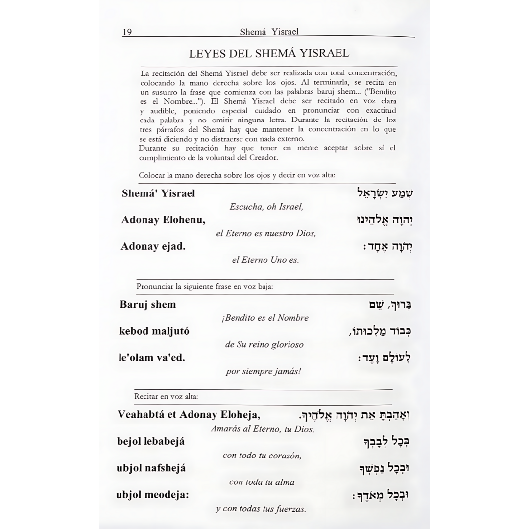 Cada oración está presentada en hebreo, acompañada de su traducción al español y una transliteración fonética lineal que facilita su recitación precisa; la disposición lineal palabra por palabra asegura que cada frase sea comprendida y pronunciada correctamente.